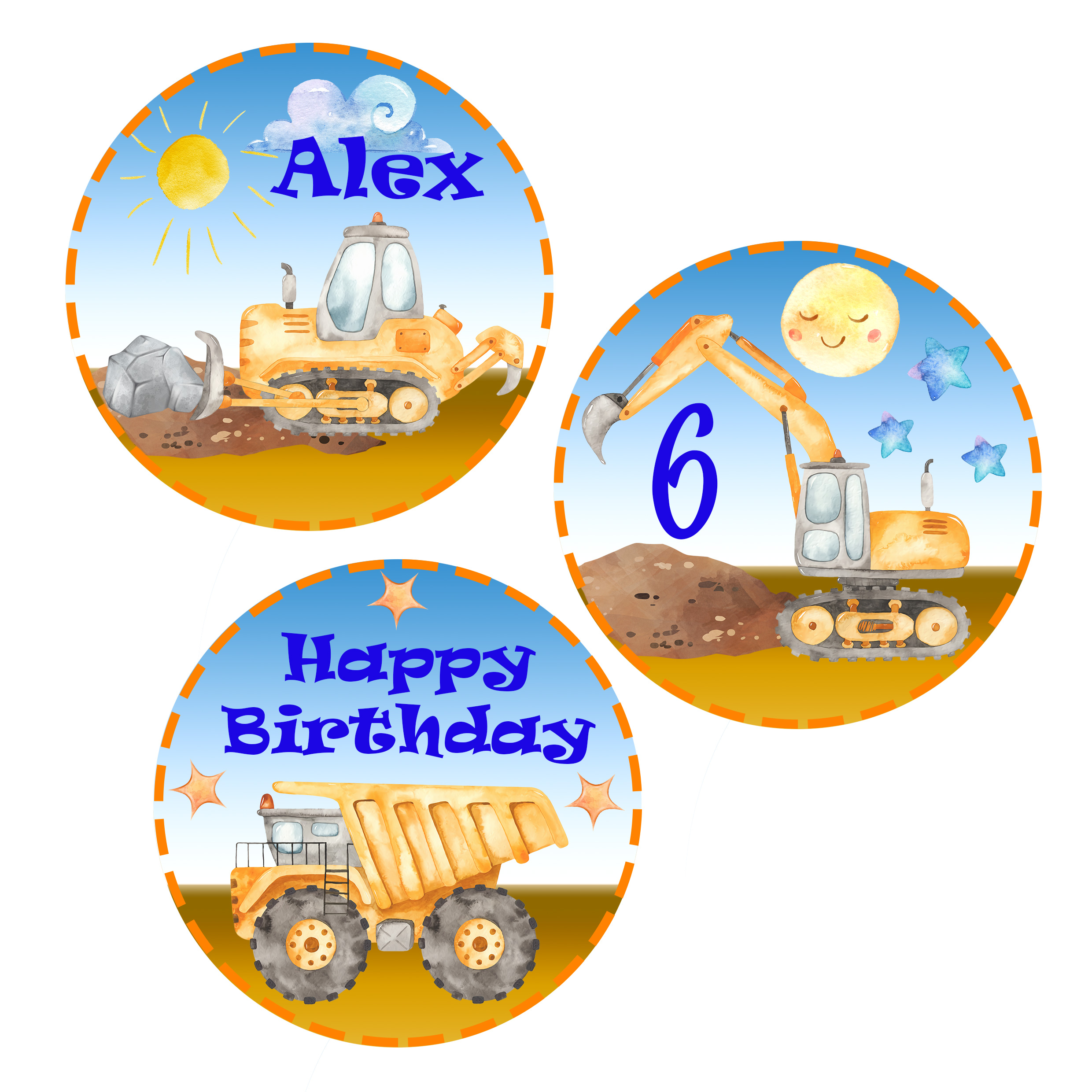 Muffin-Aufleger mit einem Baustellenmotiv, personalisiert mit einem Text wie "Happy Birthday" und dem Namen des Kindes, ist eine entzückende und kreative Art, einer Geburtstagsfeier eine besondere Note zu verleihen.