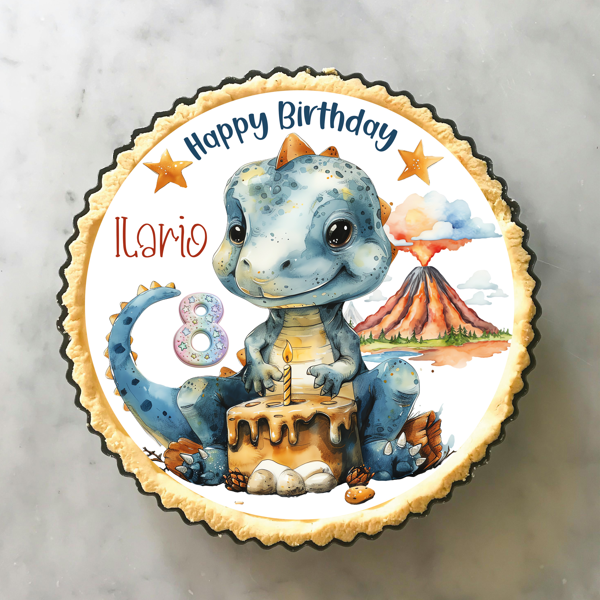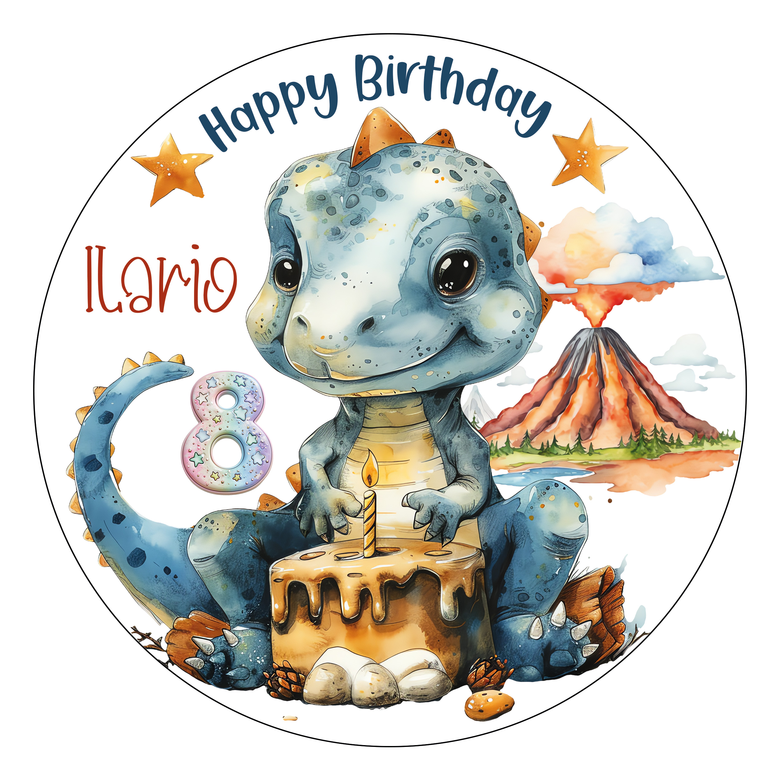 Der Tortenaufleger zeigt einen niedlichen, blauen Dinosaurier, der vor einem Vulkan sitzt und eine Geburtstagstorte mit einer Kerze bläst. Im Hintergrund ist ein weiterer Vulkan zu sehen, der Rauch ausstößt. Um den Dinosaurier herum befinden sich Steine, Blätter und Eier. Oben auf dem Bild stehen die Worte "Happy Birthday" und der Name, sowie eine "8"
