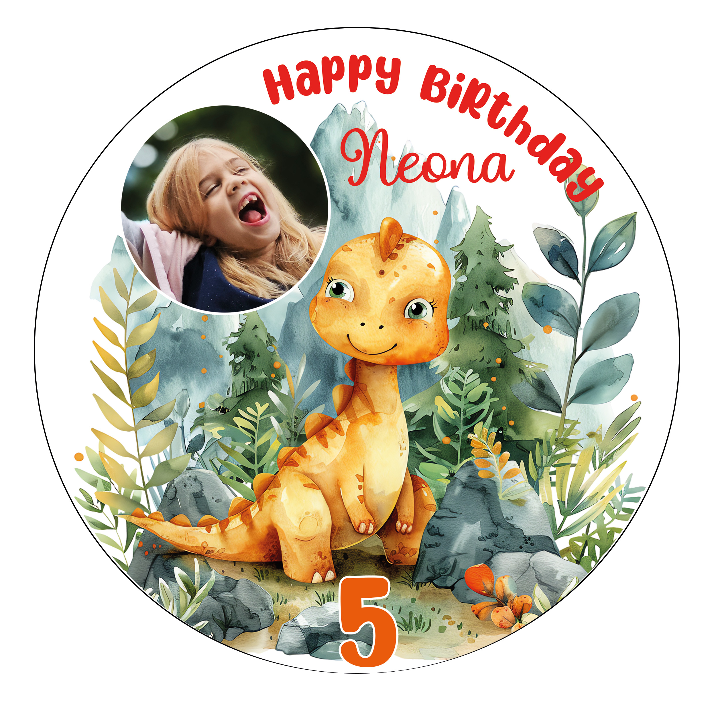 Dieser personalisierte Tortenaufleger bringt jedes Kinderherz zum Strahlen. Mit seinem bezaubernden Motiv eines fröhlichen Dinosauriers inmitten einer üppigen Naturkulisse ist er das perfekte Highlight für jeden Geburtstag.