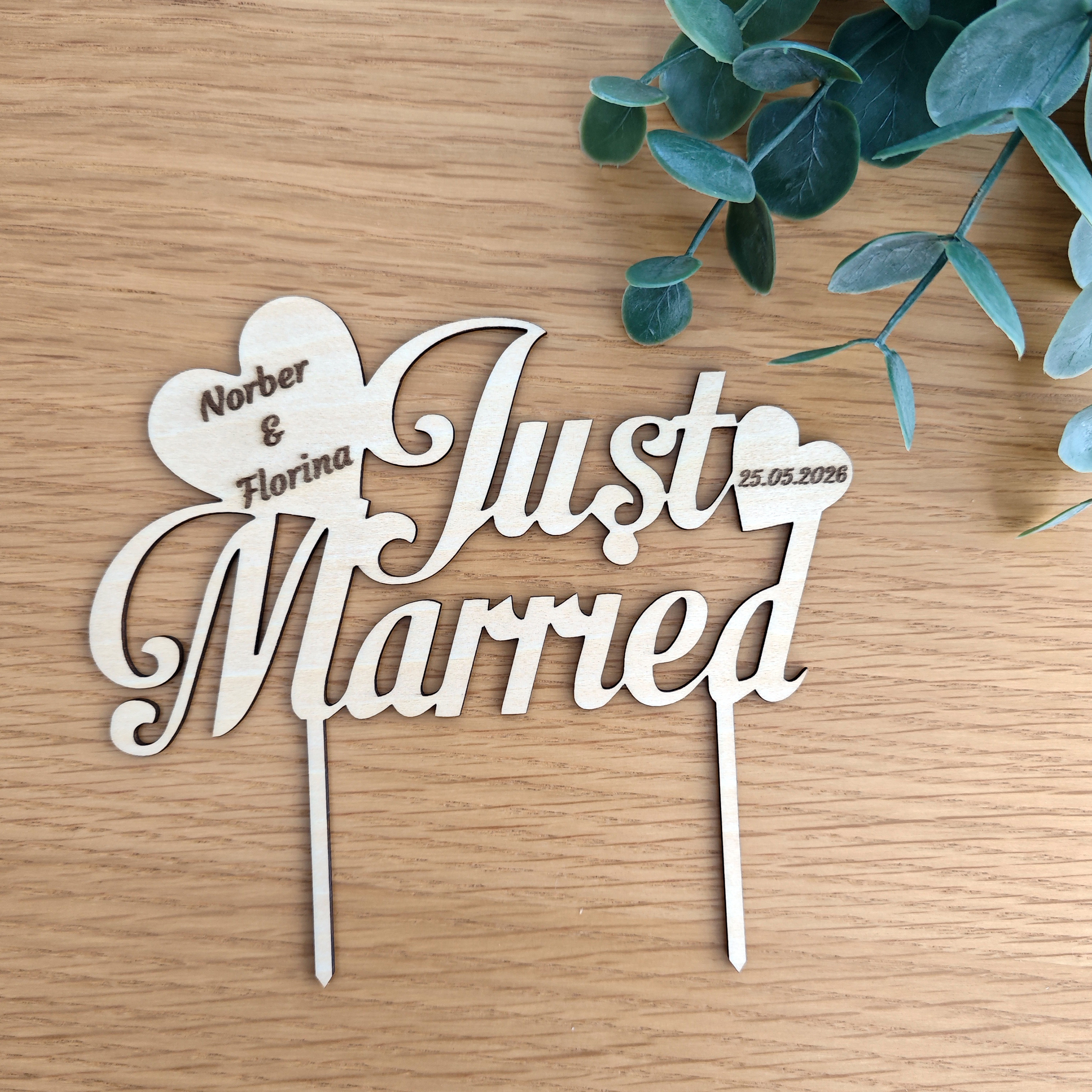 Deine Hochzeit ist ein einzigartiger Tag, und genau das sollte sich auch in deiner Dekoration widerspiegeln. Unser liebevoll gestalteter Cake Topper mit dem Schriftzug "Just Married" verleiht deiner Torte eine rustikale und zugleich elegante Note.