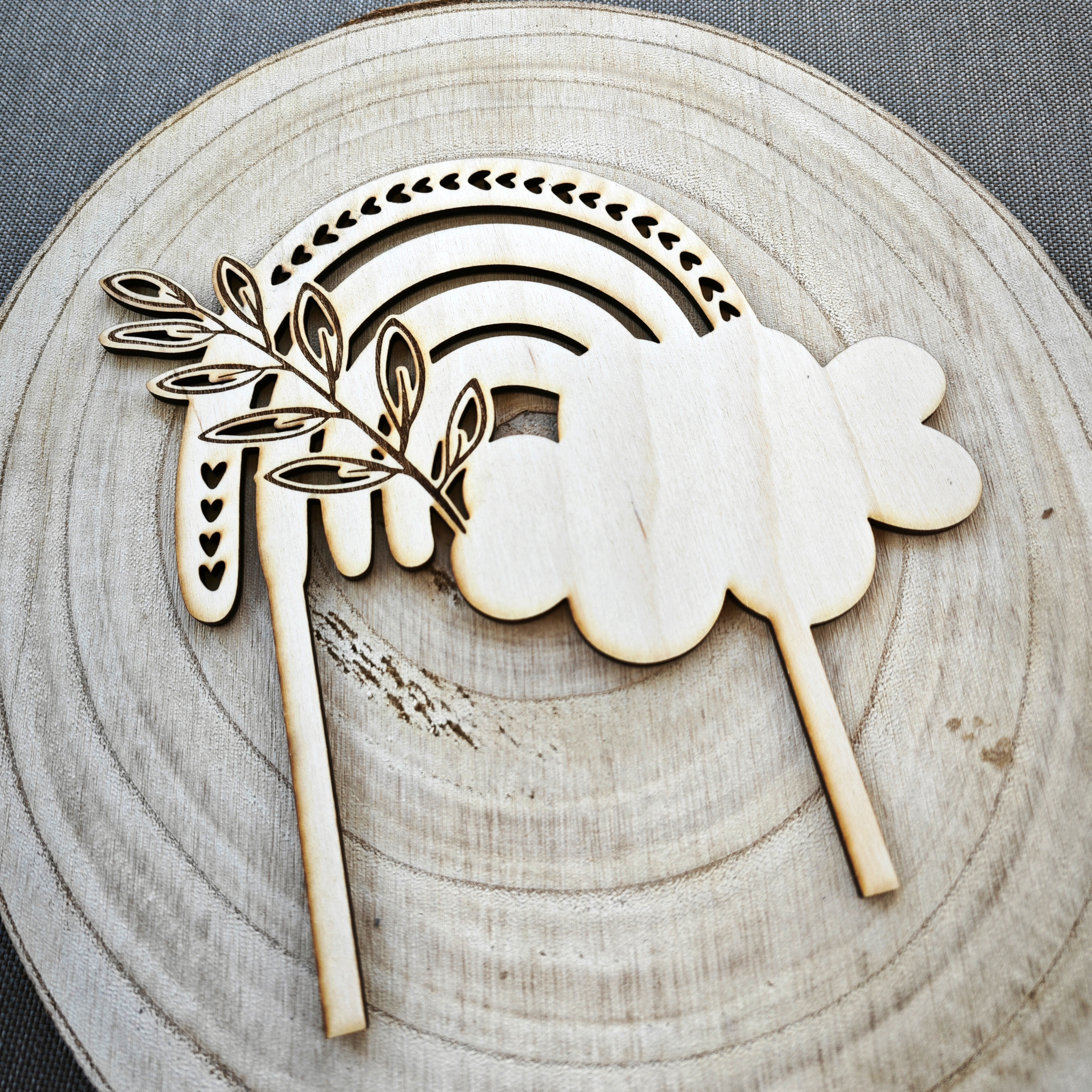 Der Holztopper mit einem Regenbogen, kleinen Herzen und einer Wolke ist eine entzückende Dekoration, die jeder Feier einen Hauch von Freude und Glück verleiht.