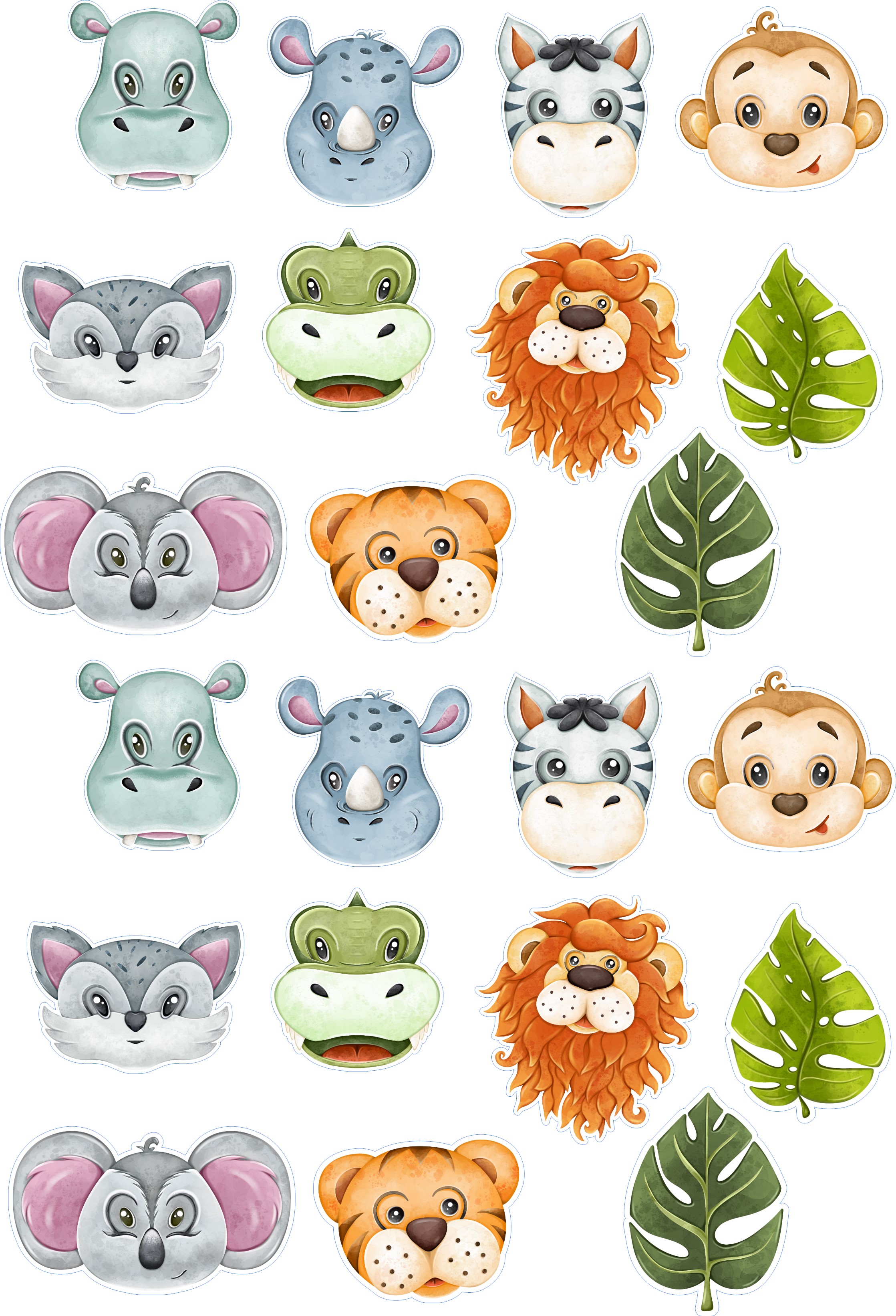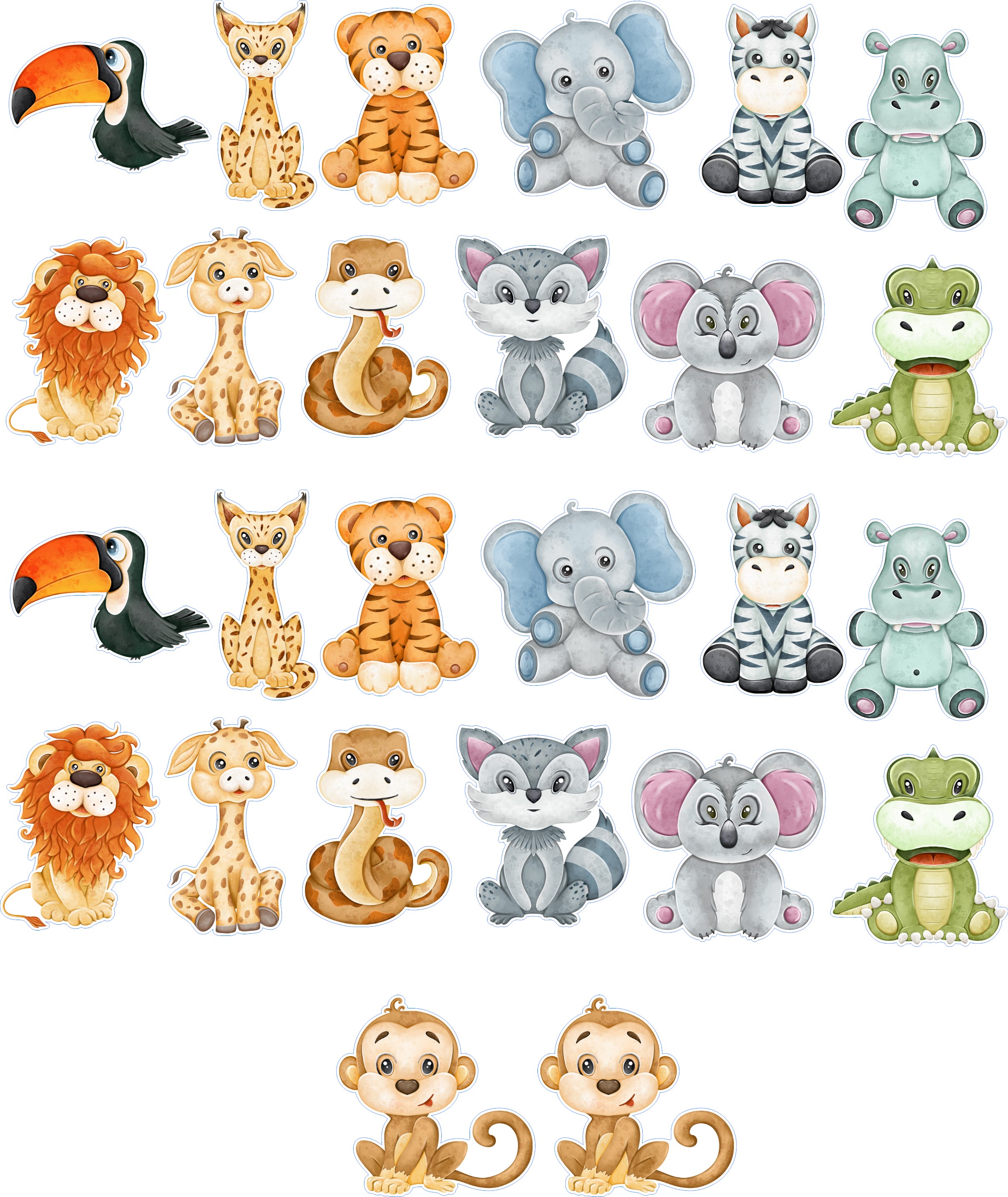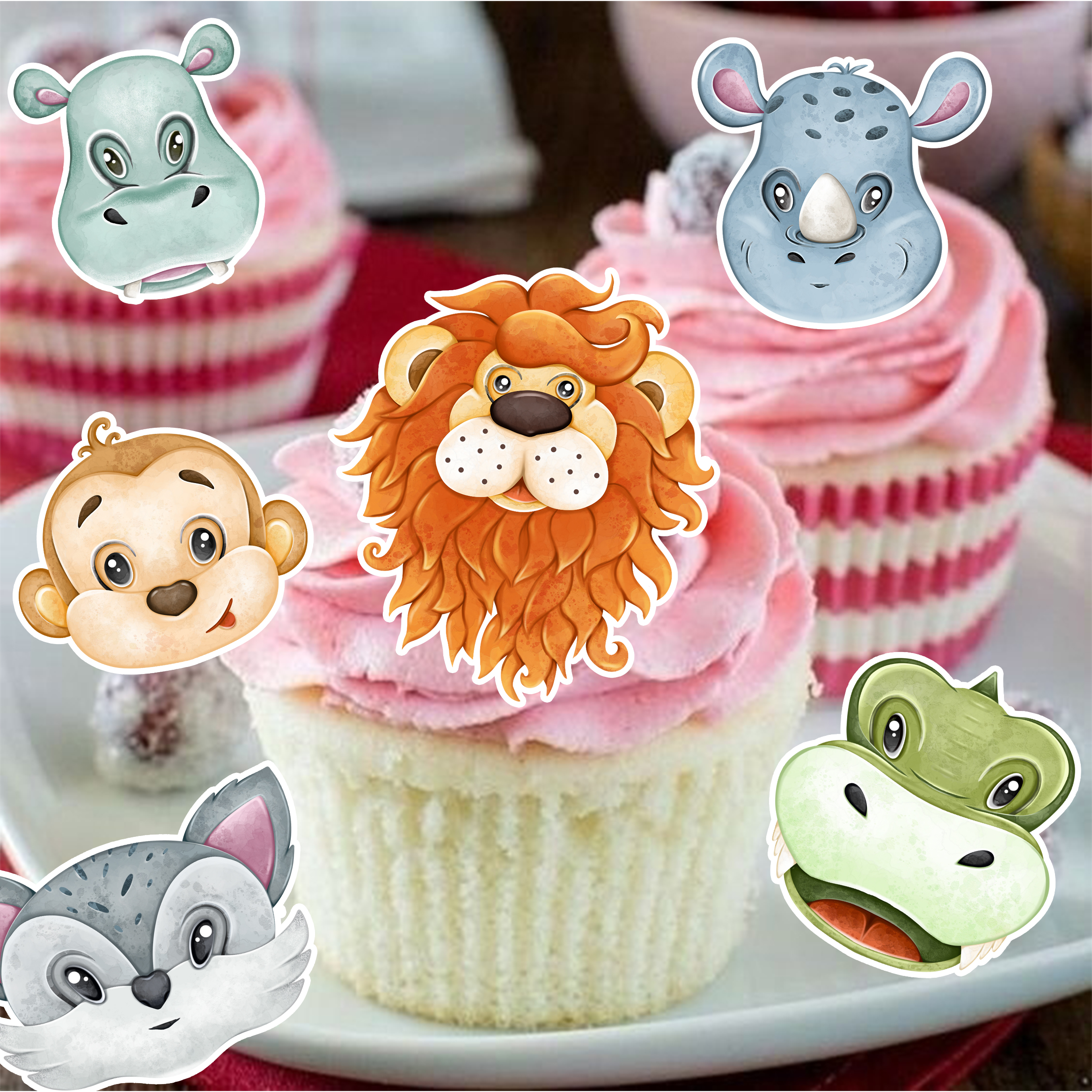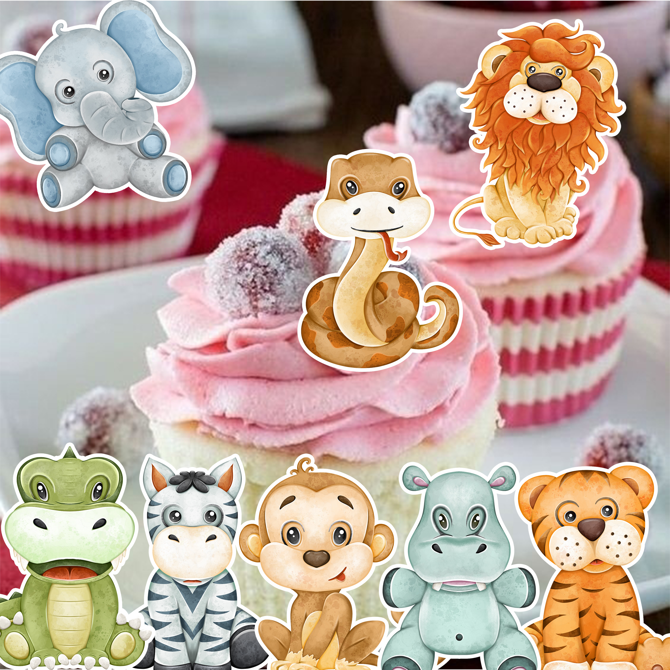 Essbare Dekoration für eine Torte oder einen Muffin im Safaristil. Man kann sie in Muffins stecken, auf Kekse kleben oder den Rand eines Kuchens verzieren. Dieses Aufleger-Set enthält einen Löwen, einen Tiger, eine Schlange, einen Koala und viele andere Dschungeltiere. Diese niedlichen Tiere sind in sanften Farben gehalten und eignen sich zum Verzieren von Backwaren.