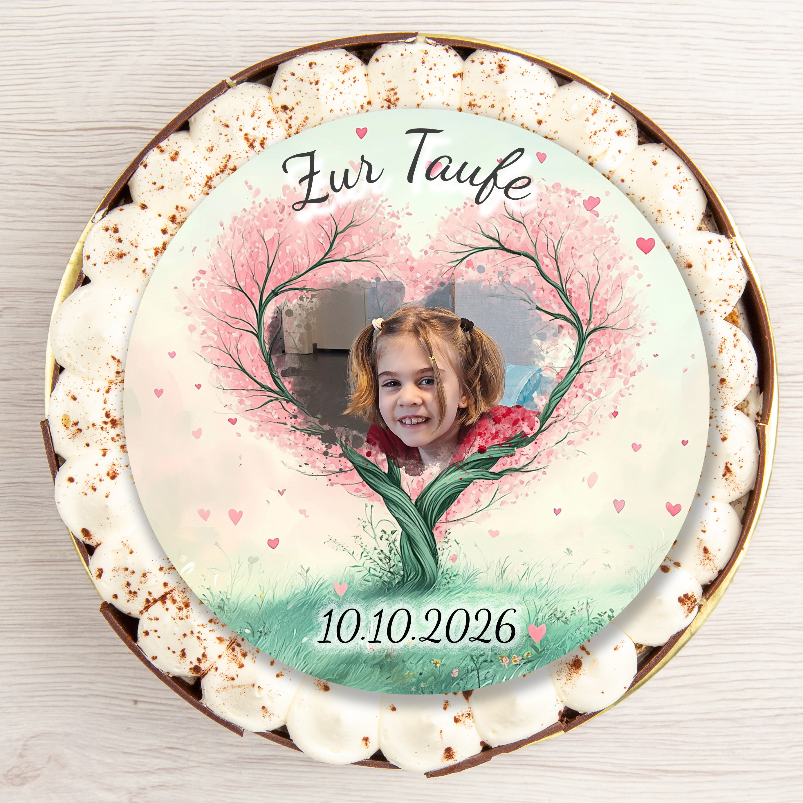 Dieser einzigartige und symbolträchtige Tortenaufleger vereint modernes Design mit tiefgründiger Bedeutung und ist der perfekte Blickfang für jede Tauffeier. Im Zentrum steht die Möglichkeit, ein persönliches Foto des Täuflings zu integrieren – umrahmt von einem kunstvoll gestalteten Baum des Lebens, der für Wachstum, Stärke und Verbundenheit steht.