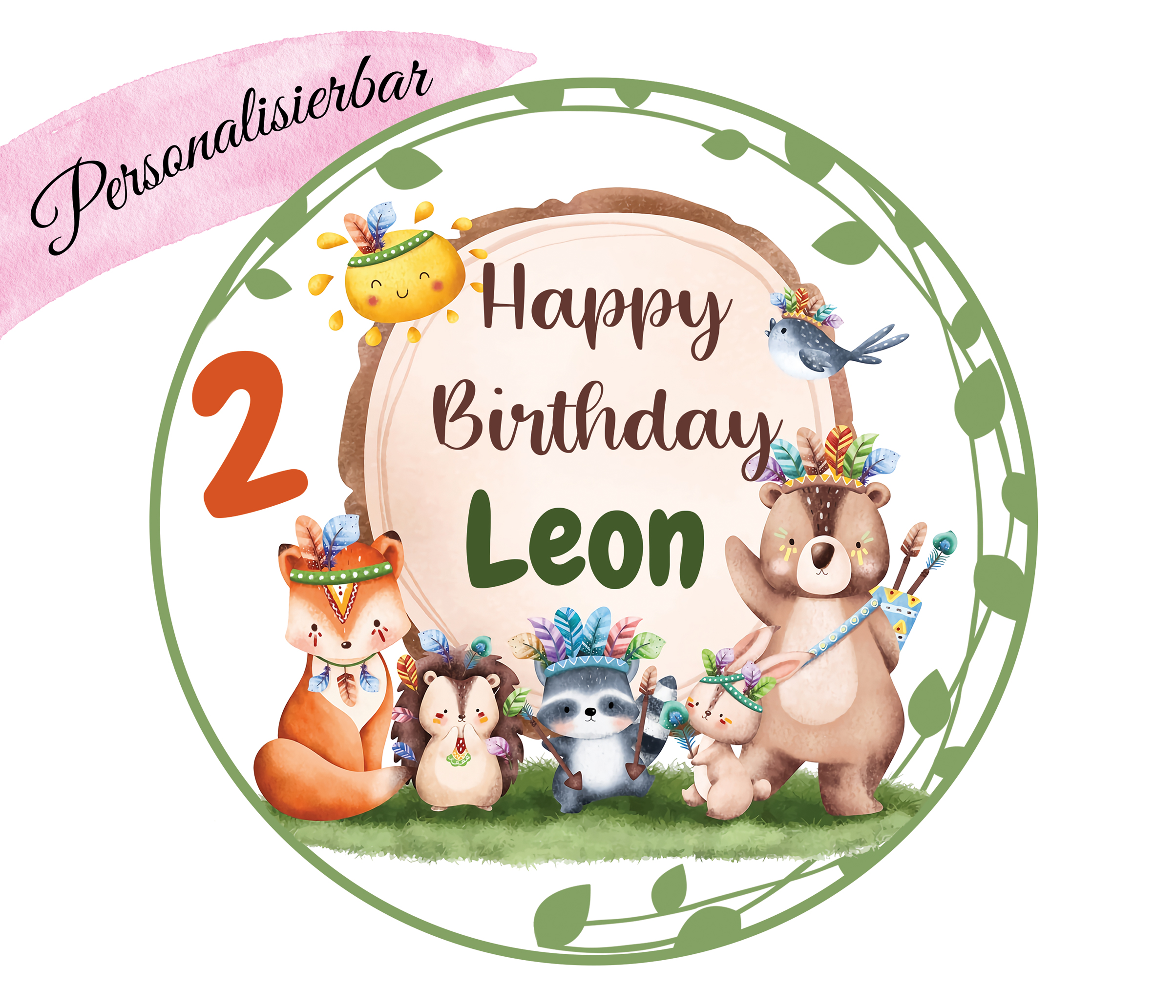 Waldtiere im Boho-Stil, umrahmt von grünen Blättern. Wenn Sie möchten, können wir Ihren Wunsch und den Namen des Geburtstagskindes in die Mitte des Auflegers schreiben. Eine große orangefarbene Zahl rundet diesen Tortenaufleger ab. Dieser Kuchen Aufleger wird nicht nur Ihre Torte, sondern auch Ihre Cupcakes verzieren.