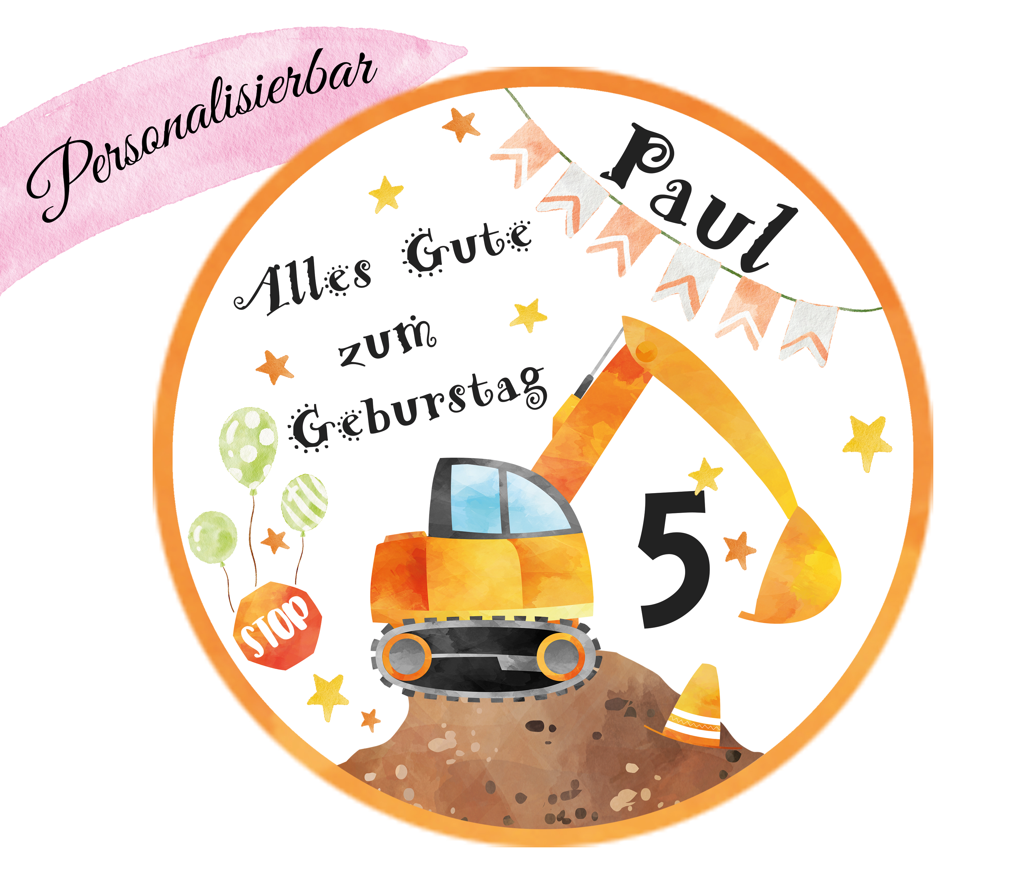 Personalisierter Geburtstagsaufleger für einen Jungen oder ein Mädchen mit Bagger, Luftballons und Sternen. Dieser und viele andere essbare Tortenaufleger für Kinder sind das perfekte Geschenk für Ihre Liebsten. Sie können ein Foto und einen Text Ihrer Wahl als Highlight hinzufügen.