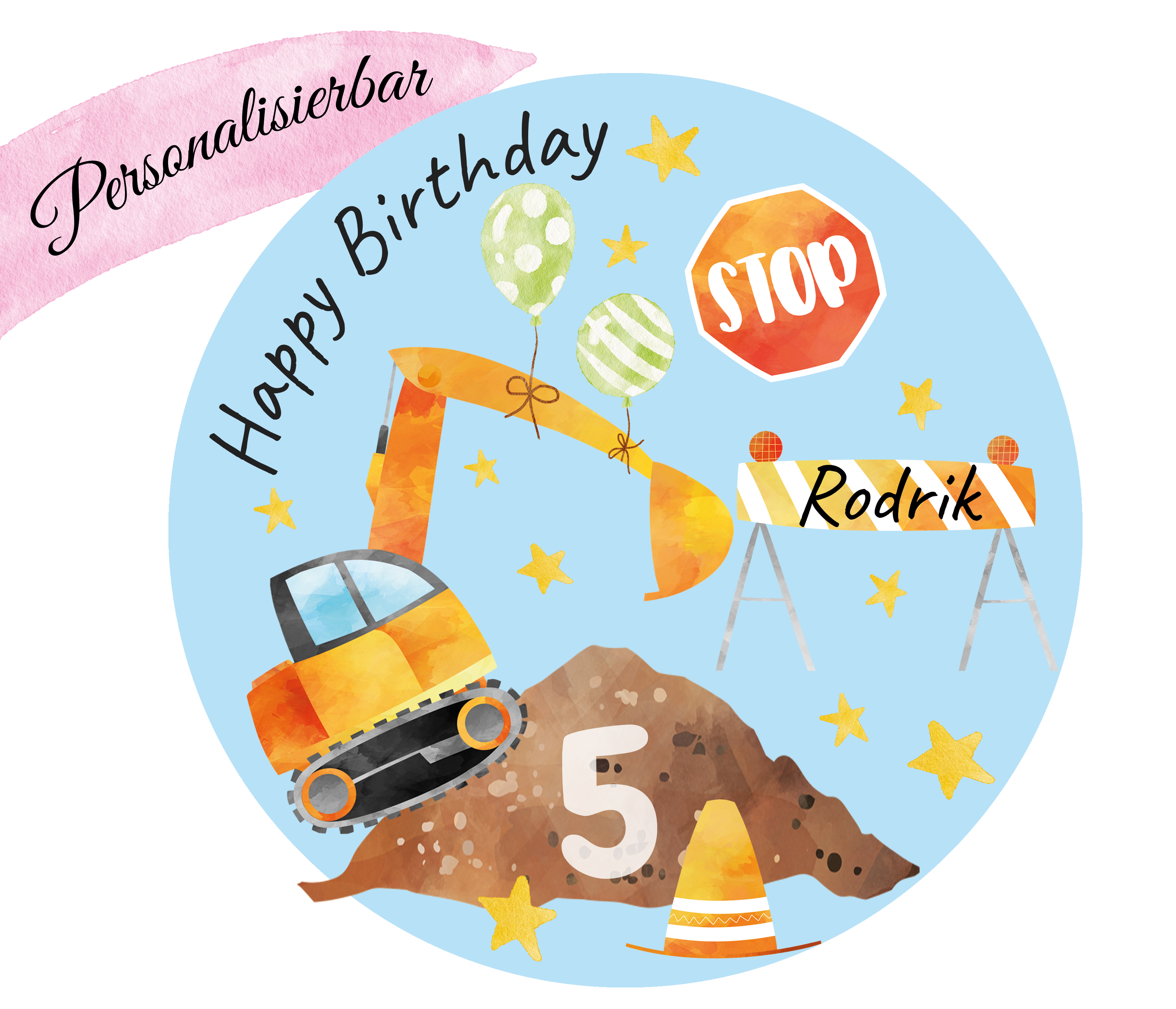 Ein wunderbarer Topper für den Geburtstag eines Jungen oder eines Mädchens. Auf dem blauen Hintergrund ist ein Bagger zu sehen, an dem grüne Luftballons baumeln. Gestalten Sie den Geburtstag Ihres Kindes, den runden Geburtstag, den 1. Geburtstag eines Jungen mit unserem schönen runden Tortenaufsatz in sanften Pastellfarben. Dieser personalisierte Bagger-Tortenaufsatz passt zum Thema Baustelle und ist auch das perfekte Geschenk für Ihre Lieben. Sie können ein Foto und einen Text Ihrer Wahl als Highlight hinzufügen.