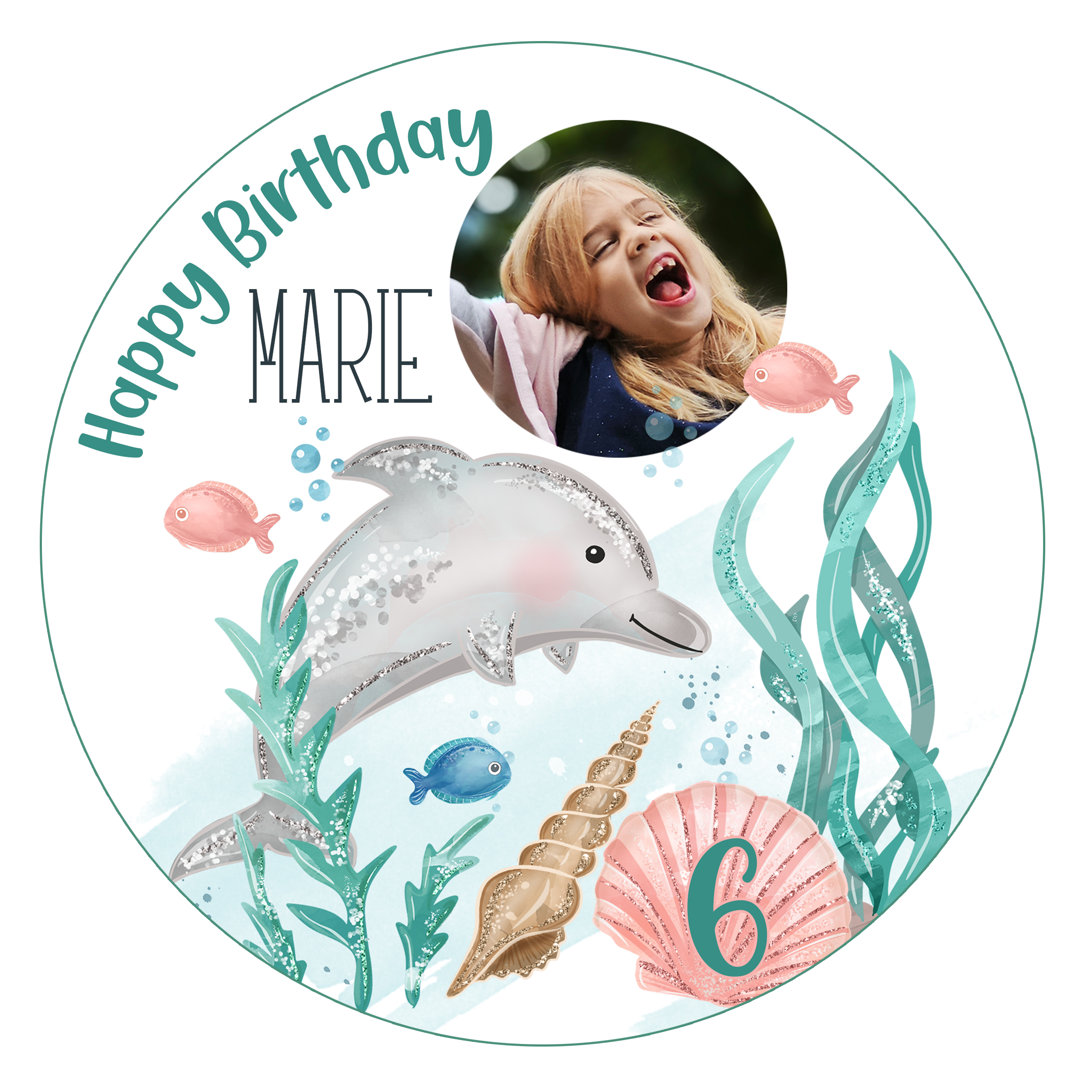 Ein schöner essbarer Aufleger in Blau für DeineTorte oder Ihre Muffins. Dieser personalisierte Tortenaufleger mit Delfin und Muscheln ist das perfekte Geschenk für deine Liebsten. Du kannst einen Text Ihrer Wahl als Highlight hinzufügen.