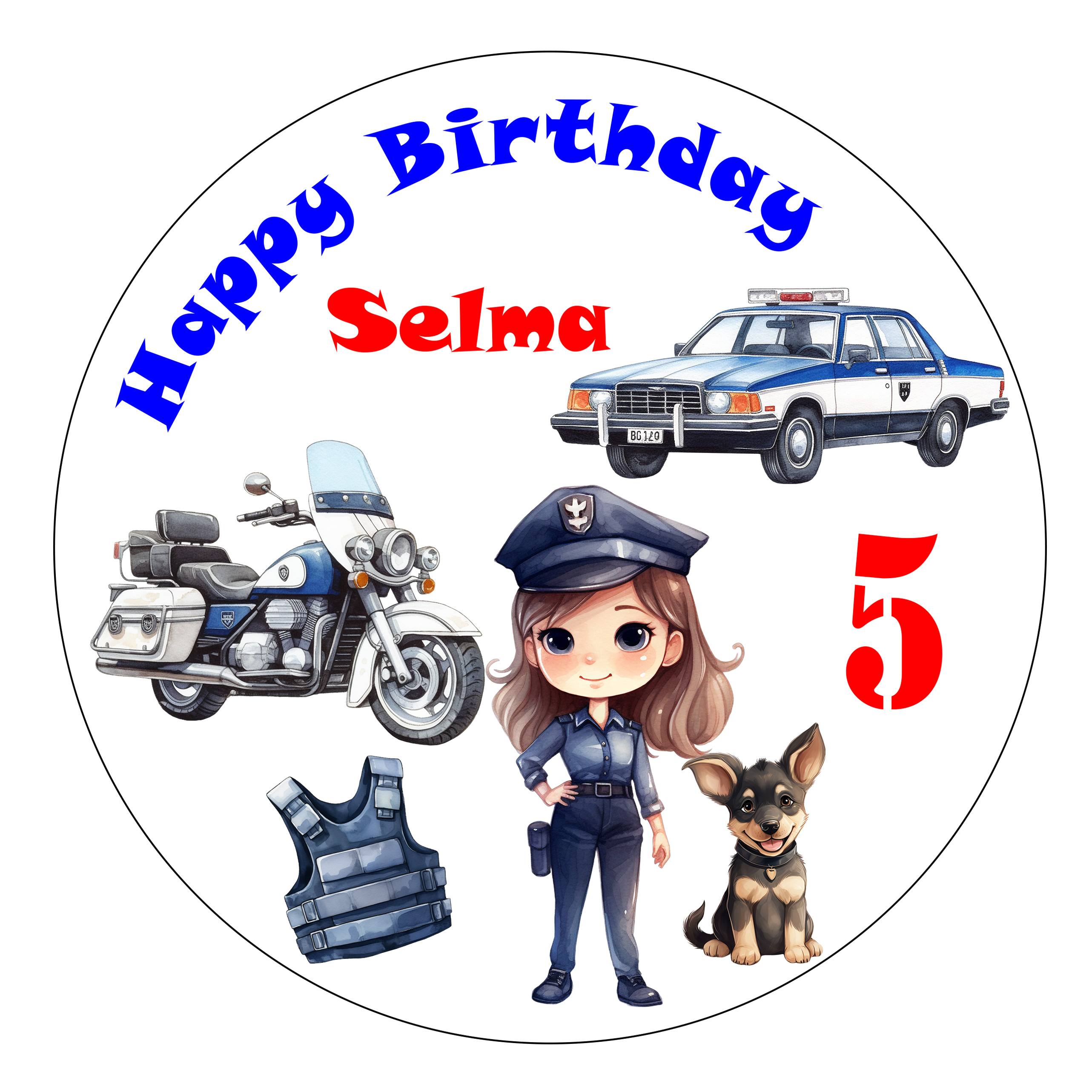 Unser handgemachter Tortenaufleger Polizei Mädchen in runder Form für Jungen wird Ihre Gäste und Familie auf der Geburtstagstorte verzaubern. Einzigartiges essbares Tortenbild mit lebendigem Lebensmitteldruck, das auf keiner Geburtstagstorte fehlen darf. Überraschen Sie Ihr Geburtstagskind mit einer Torte und dieser wunderschönen personalisierten Tortenbild.