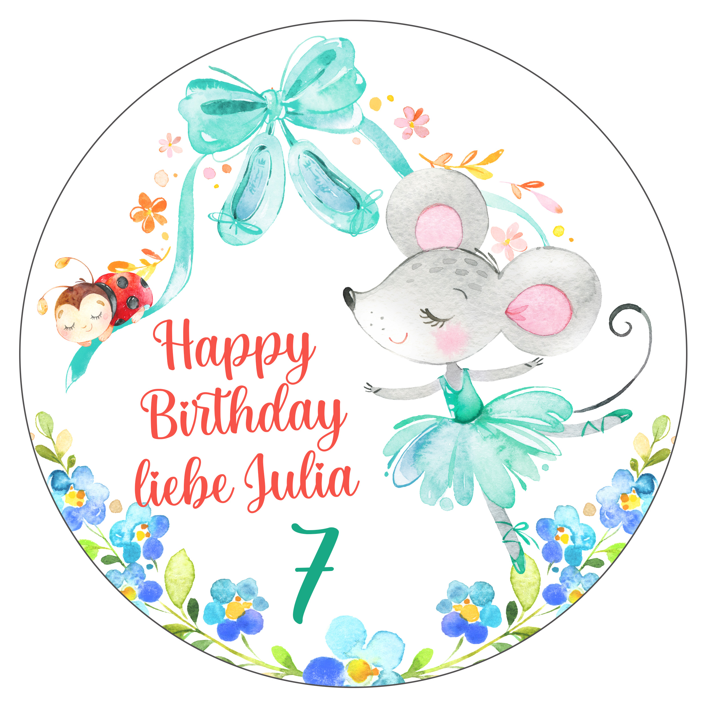 Ein schöner essbarer Aufleger in Blau für Ihren Torte oder Ihre Muffins. Dieser personalisierte Tortenaufleger mit Maus, MArienkäfer, Balletschuhe ist das perfekte Geschenk für Ihre Liebsten. Sie können einen Text Ihrer Wahl als Highlight hinzufügen.
