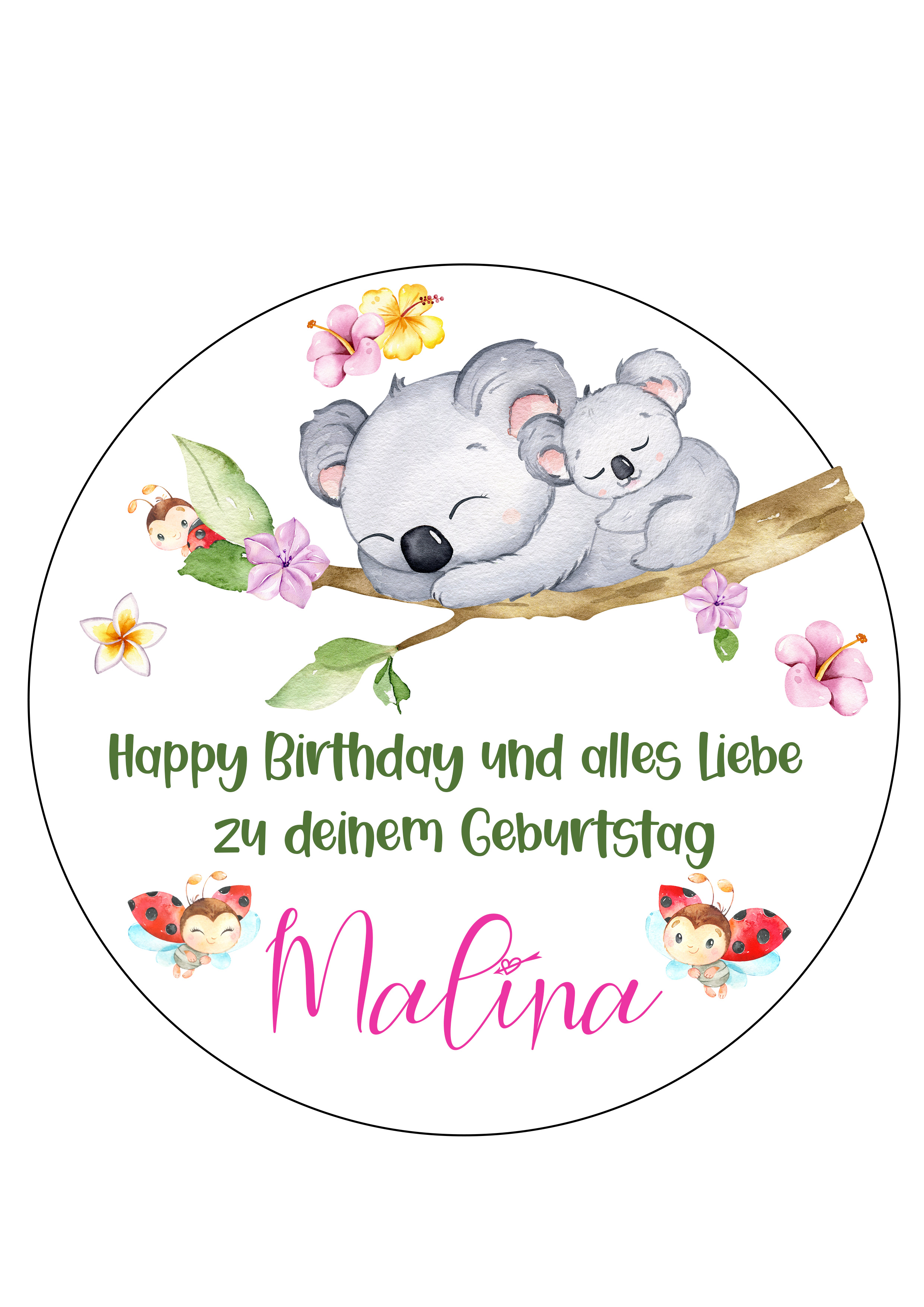 Ein schöner essbarer Aufleger in schönen Farben für Ihren Torte oder Ihre Muffins. Dieser personalisierte Tortenaufleger mit Koalas und Blumen, Marienkäfer ist das perfekte Geschenk für Ihre Liebsten. Sie können einen Text Ihrer Wahl als Highlight hinzufügen.